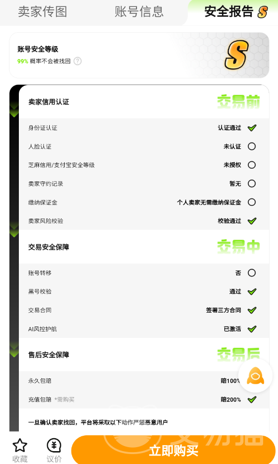 安全就是交易猫的核心底色,也是它的硬核优势。交易猫有独特的官方托管和担保机制,给大家构建一个相对安全的交易环境。当你委托官方托管以后,交易员会帮你上号验证,截图采集信息,而买家下单以后也无需验号,由交易员帮助换绑邮箱和实名等。还可以查看该商品的安全报告评分,选购高评分的号。