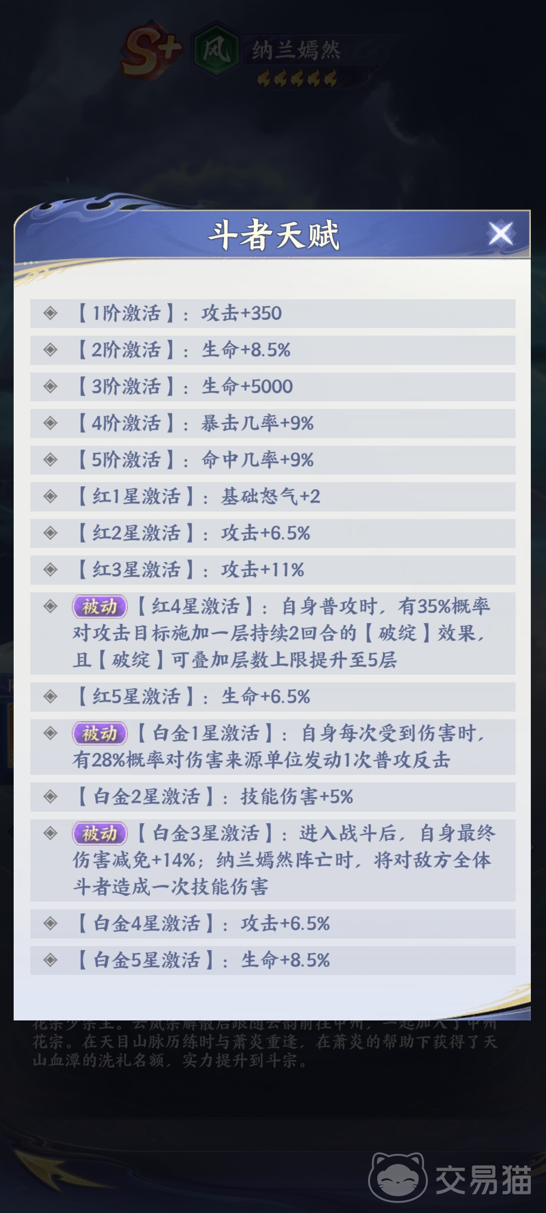 “破绽”机制具有显著战术意义:每层可提升我方对其造成的伤害,最高可叠加至三层。当纳兰嫣然处于理想练度(如天赋升至红四星)时,该效果将稳定触发,大幅强化对敌方核心单位的压制力。此外,其天赋系统兼顾输出与生存,在基础属性成长方面提供生命、攻击等多维加成,保障持续作战能力。