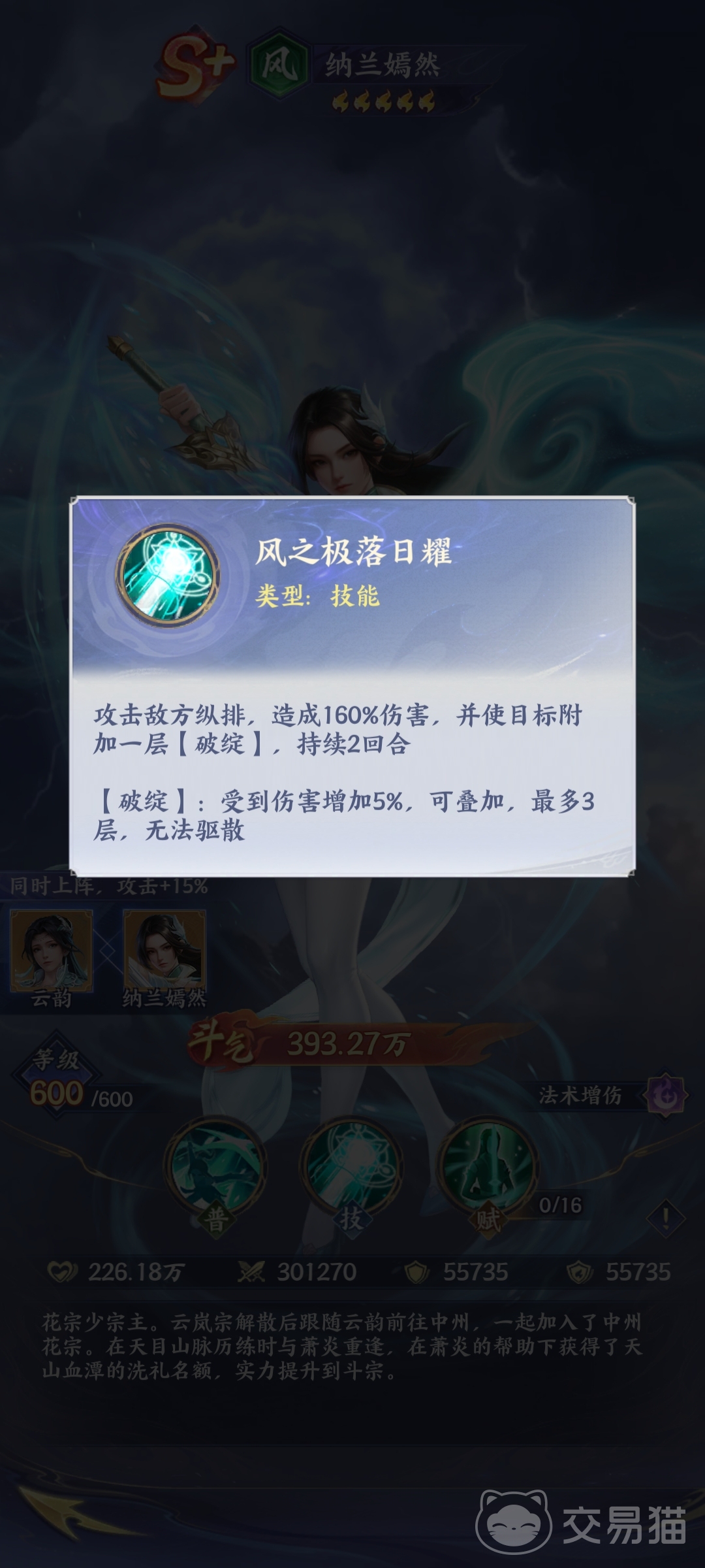 纳兰嫣然为S+阶斗者,核心价值在于团队增伤与状态压制的双重能力。她的普攻可对单体目标造成伤害并施加“破绽”效果;而大招“风之极·落日耀”则能精准打击敌方前排单位,造成高额爆发伤害的同时,额外叠加一层“破绽”。该状态可持续两回合,是触发后续连锁伤害的关键前置条件。
