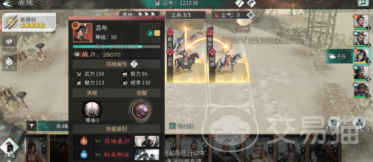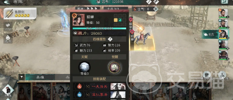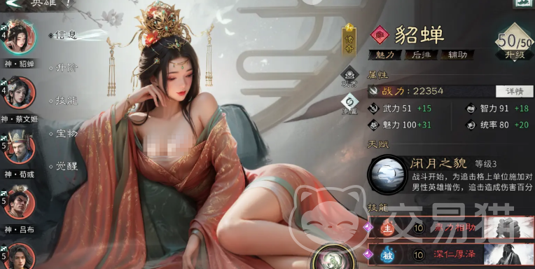 天赋技能“闭月之貌”具备等级成长性,战斗初始即自动生效:为处于追击格位的我方武将施加针对男性英雄的增伤状态,且该状态下所有追击伤害均按100%比例全额触发,显著放大追击链的威胁性。