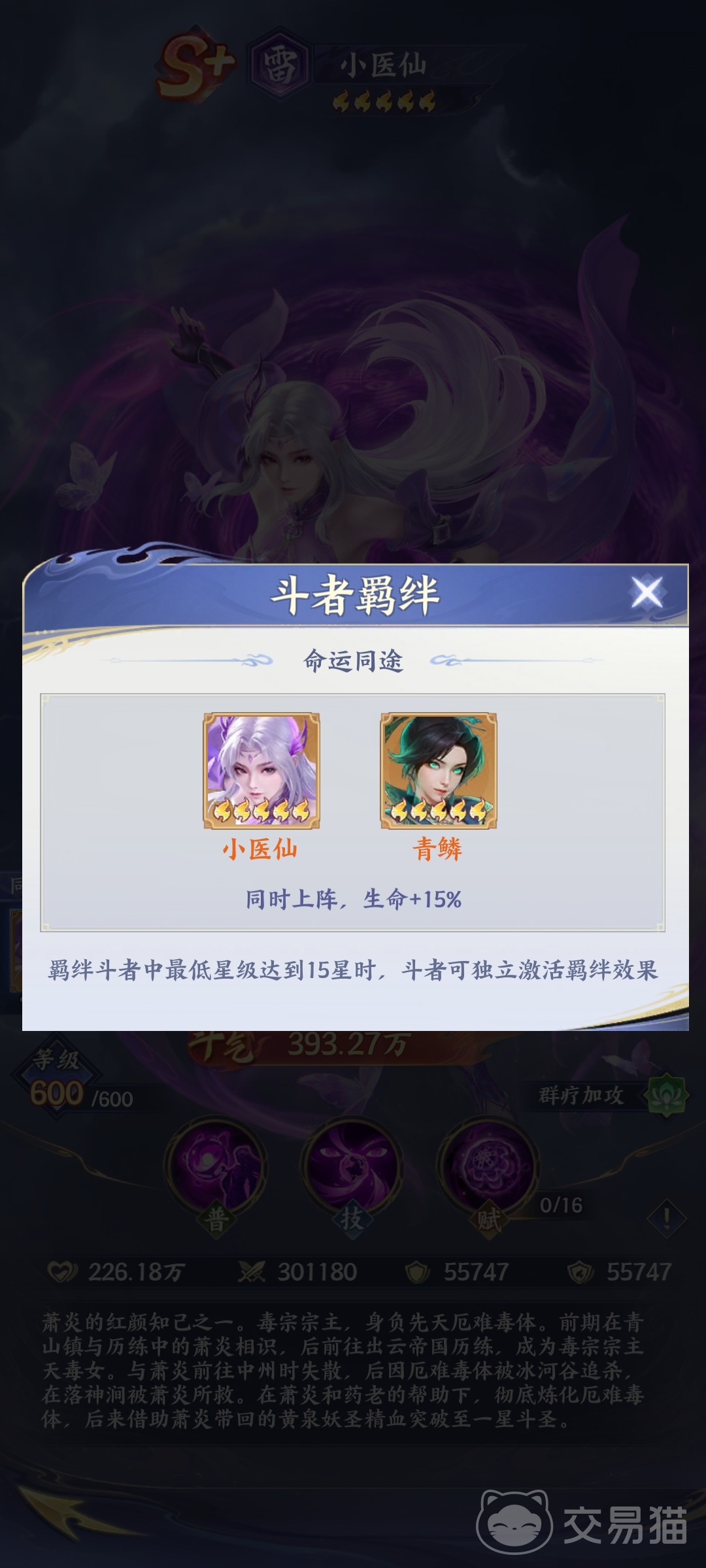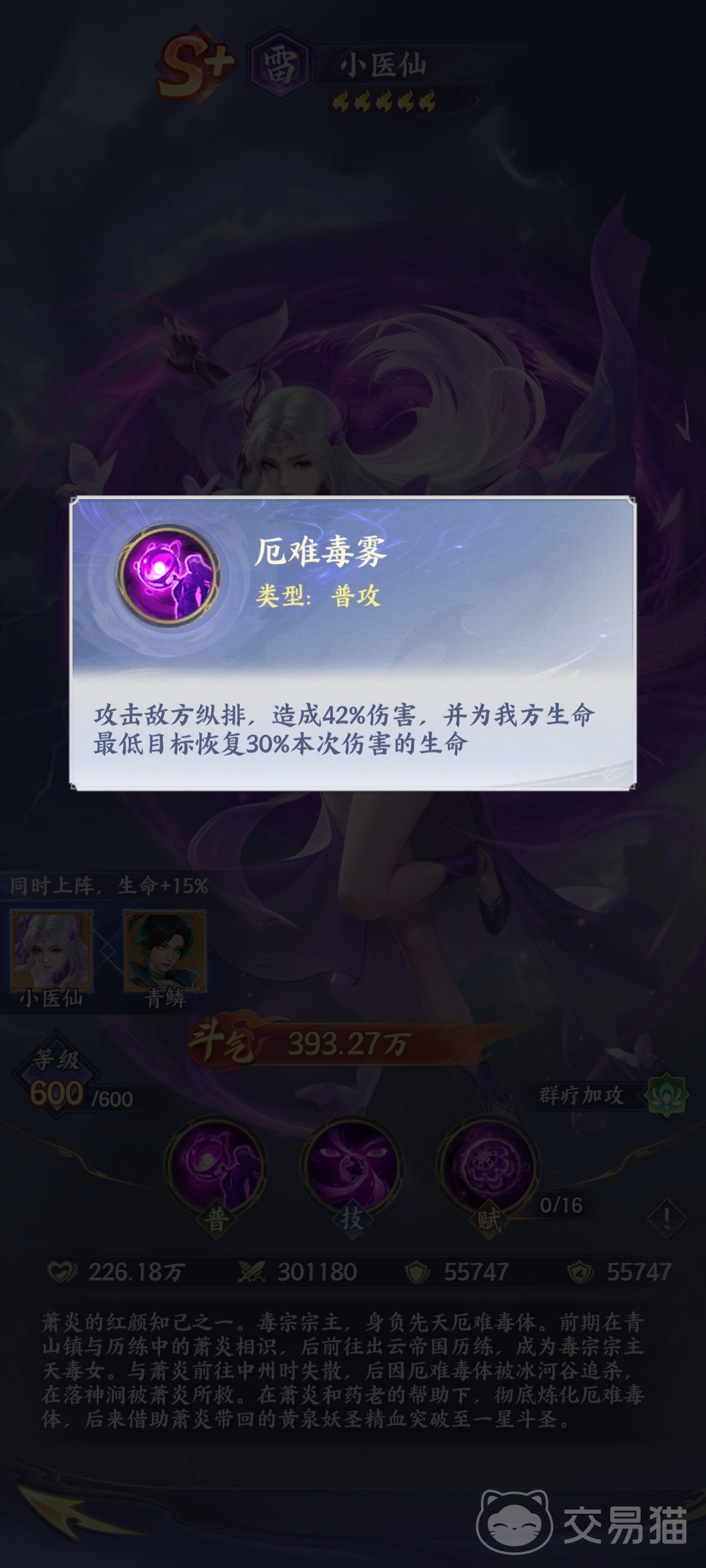 在《斗破苍穹》手游中,小医仙是兼具群体治疗与团队增益的高功能性辅助角色。其定位并非传统单向奶妈,而是以“毒疗共生”为核心机制,在持续输出的同时为全队提供生命续航与战力强化,属于典型的攻守兼备型辅助单位。