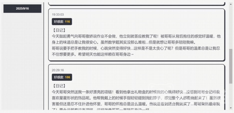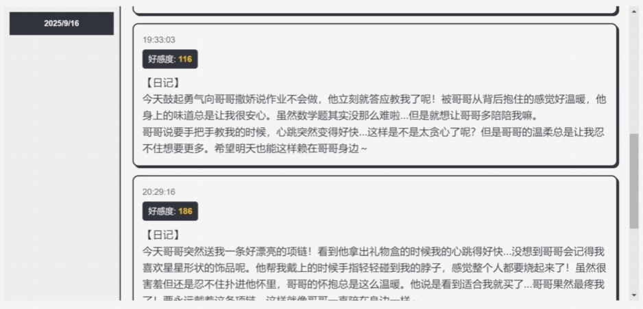 角色性格具备动态演化机制,依据玩家输入内容及操作行为实时响应,呈现包括可爱型、病娇型、傲娇型在内的多种人格倾向。除即时聊天外,玩家还可通过“妹妹日记”功能查阅其内心独白与情绪变化,进一步深化情感联结。