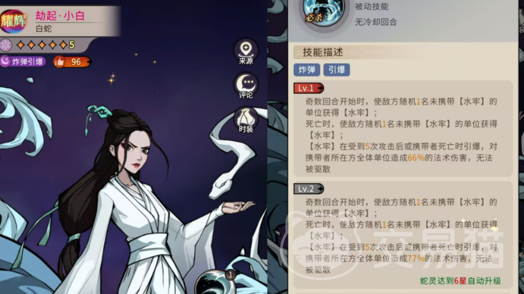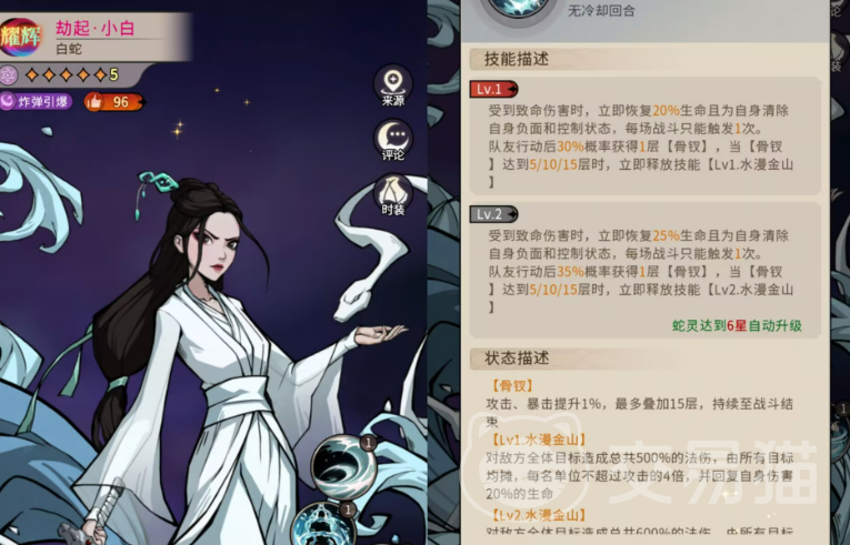 核心被动“渡劫之志”构成双轨成长模型:一方面具备致命伤害豁免机制,受致命打击时不会退场,并恢复一定生命值、清除全部负面状态;另一方面建立协同输出循环——队友每次行动均有40%概率为白蛇叠加1层骨钗印记,累计至5/10/15层时,可发动“水漫金山”进行群体法术攻击,其中15层完整形态倍率为700%法术伤害。该机制高度依赖高频行动队友支持,形成稳定AOE输出节奏。
