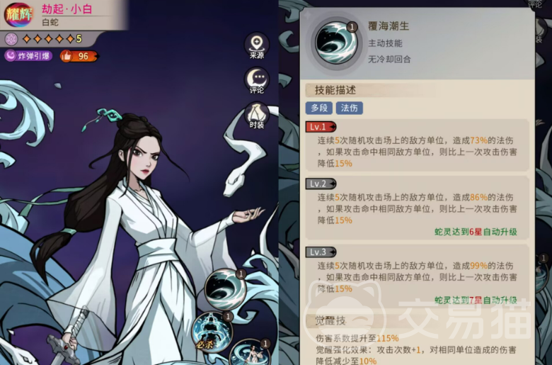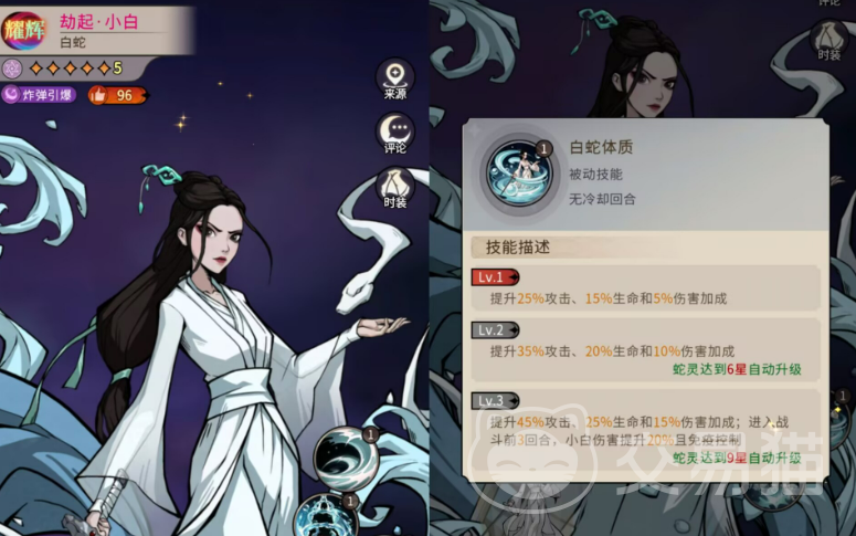 被动“白蛇体质”提供关键生存保障:角色达到9星后,前3回合内免疫所有控制效果。该特性在PVP对战及高难度团队副本中尤为关键,有效规避敌方开局强控链,确保核心输出节奏不被中断。