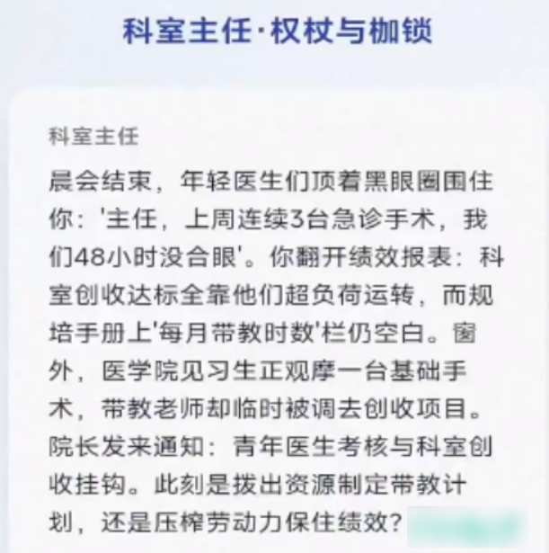 游戏开局即确立角色身份:一名刚取得执业资格的年轻医师。没有预设金手指,所有决策均需权衡风险与伦理——面对危重患者是坚持保守治疗还是果断手术?在科研任务与临床值班冲突时如何取舍?这些并非虚构桥段,而是真实存在于我国住院医师规范化培训体系中的典型情境。