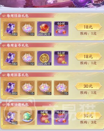 蜕骨丹主要通过【每周回馈礼包】获取:该礼包定价30元,每周限购三次,每次购买固定获得1枚蜕骨丹,并额外附赠2个6小时资源袋及300紫晶。对于处于阵容迭代期或尝试多路线培养的玩家,该礼包具备明确的性价比优势,可显著降低试错成本。