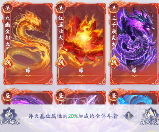 成功激活帝炎、虚无吞炎后,可解锁全队共享的羁绊加成:异火基础属性值20将均摊至所有出战角色,显著提升整体输出与续航能力;海心焰、火云水炎具备减伤特性,在竞技场、跨服战等PVP场景中可大幅增强生存容错率;所有异火均需通过碎片合成获取,每种异火收录后同步点亮图鉴,集齐全部异火将解锁专属收藏成就及隐藏奖励。