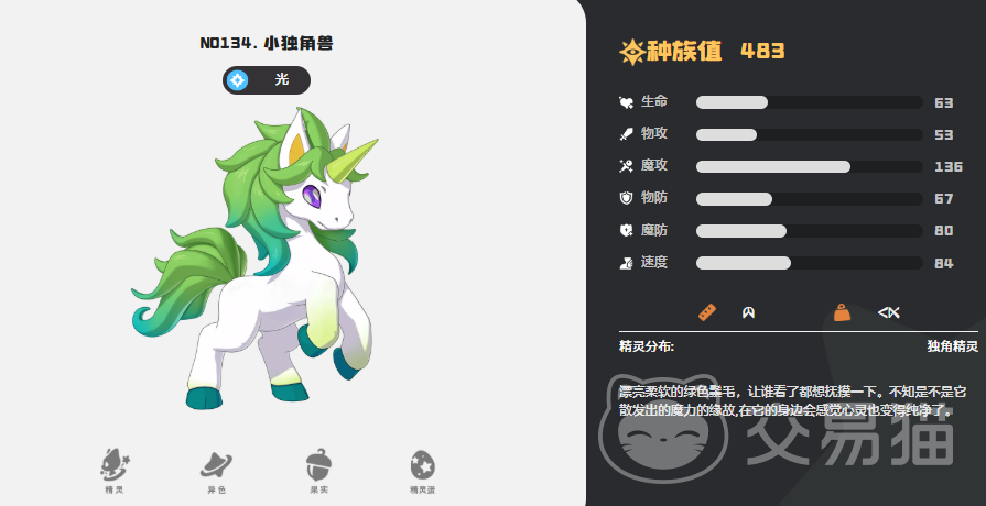 魔法攻击(Sp.Atk)最高者为小独角兽,种族值136。作为光系输出核心,其机制设计强调技能克制逻辑:使用非光系技能时,威力提升25%。因此配招需规避光系技能重复叠加,优先搭配水、草、超能等异系输出技以最大化爆发。雪影娃娃以132点魔攻紧随其后,是当前版本中除小独角兽外魔攻上限最高的精灵,适合承担副C或功能型法系输出角色。