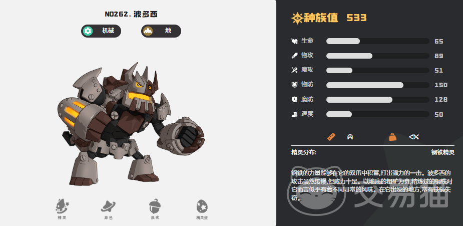 物理防御(Def)种族值登顶的是波多西,高达170点。这一数值使其天然适配坦克定位,在机械系或大地系阵容中均能发挥稳定承伤作用。其特性“定向精炼”可在己方精灵释放本系防御类技能时,提升该技能10%效果强度,强调属性协同与技能链配合,对阵容构筑提出明确属性一致性要求。