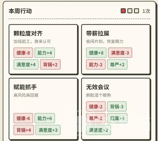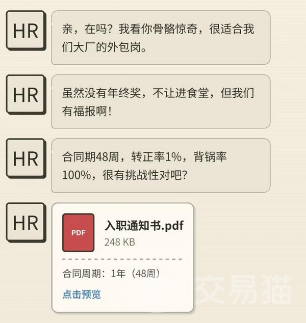 作为一款以真实职场压力为蓝本的模拟作品,玩家将扮演一名外包岗位从业者,在虚拟的大厂协作体系中承接项目、协调排期、响应需求变更,并在有限行动点数下权衡效率与健康值、KPI完成度与人际关系维护等多重变量。游戏采用阶段推进式节奏,每季度需完成目标考核,同时应对加班邀约、临时插单、流程卡点等典型场景,强调策略规划与长期决策能力。