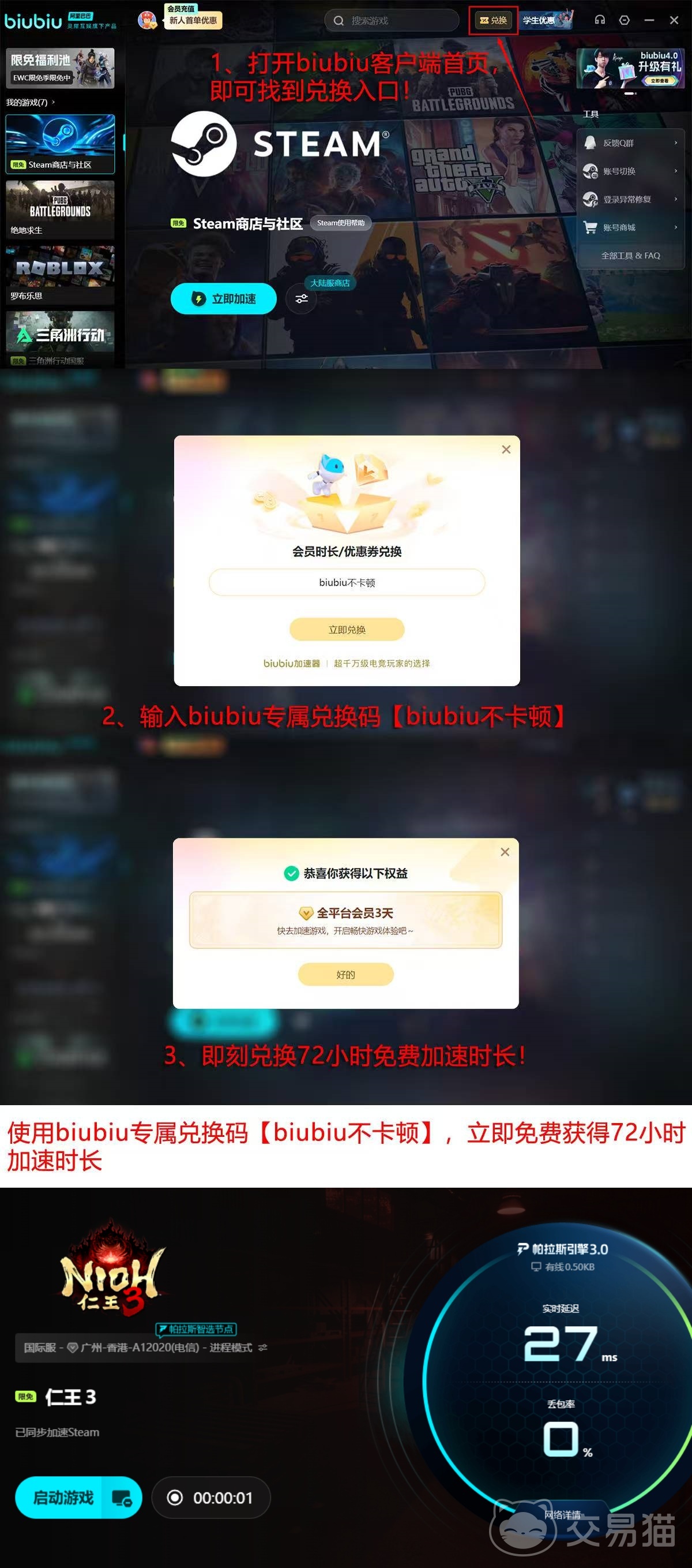 新用户首次启动biubiu加速器时,系统将自动发放24小时全功能免费加速时长。若需延长使用周期,可在激活界面输入兑换码【biubiu不卡顿】,即可额外获得3天连续加速权益。