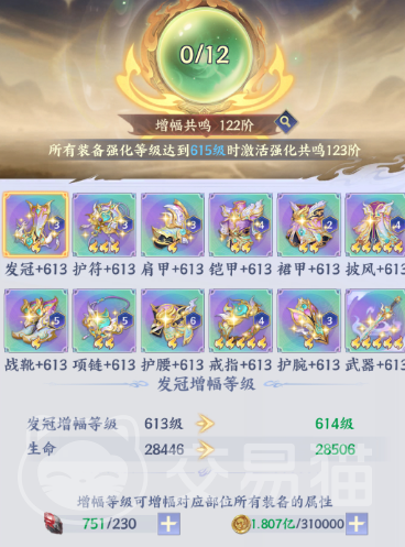 增幅系统是装备属性提升的第一优先级路径。各部位独立消耗增幅石与金币进行等级提升,每级增幅均直接强化该部位专属属性(如发冠增幅提升生命上限)。当12件装备增幅等级完全一致时,触发强化共鸣机制:例如全部达成615级增幅,即可解锁强化共鸣123阶,获得叠加式属性加成。实战建议聚焦输出核心位(武器、戒指)优先拉满,以快速突破斗气阈值,提升副本通关效率。