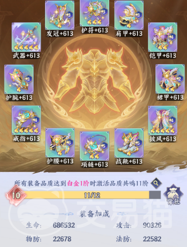游戏内共设12件核心装备位,涵盖铠甲、护符、武器、护腕、戒指、披风、发冠等部位。获取途径覆盖主线推进、限时活动结算及高难度副本掉落。每件装备均提供生命值、物理防御、攻击力等基础数值,并支持品质进阶——当全部12件装备同步达到同一品质阶段(如统一升至白金一阶),即可激活对应阶数的品质共鸣石效果,实现全属性跨档提升。