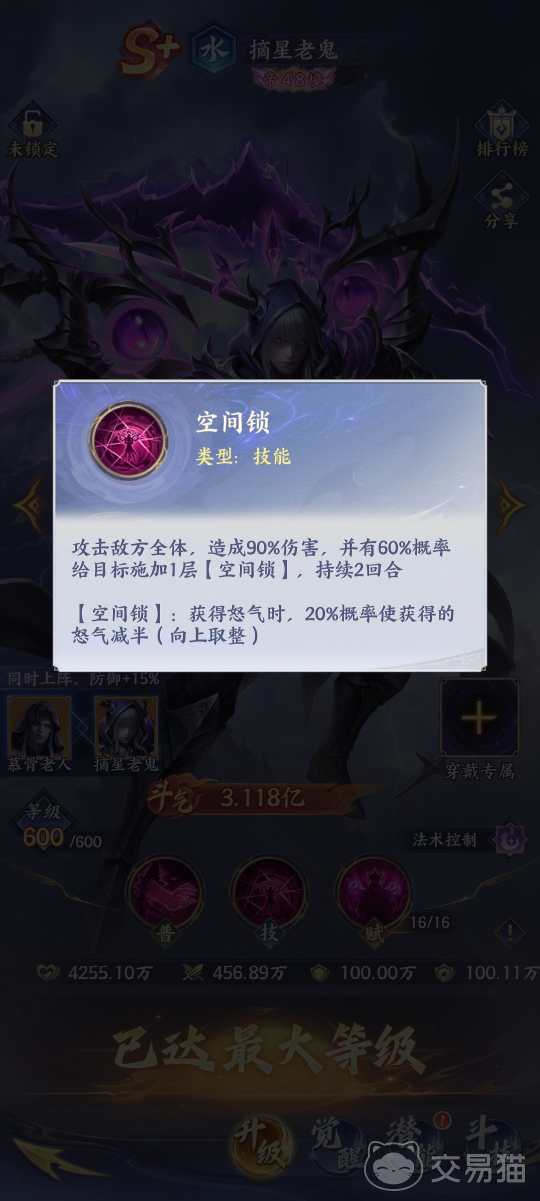 该角色的核心机制围绕“空间锁”展开:技能可对敌方全体造成90%基础伤害,并有60%概率施加持续两回合的“空间锁”减益效果。此状态将使目标在获取怒气时,额外承受20%概率的怒气削减(即实际获得怒气减半),从而有效延缓敌方大招释放节奏,实现从能量源头进行压制。此外,摘星老鬼与慕骨老人存在专属羁绊——两人同时登场时,全队防御力提升15%,显著增强阵容生存容错率。