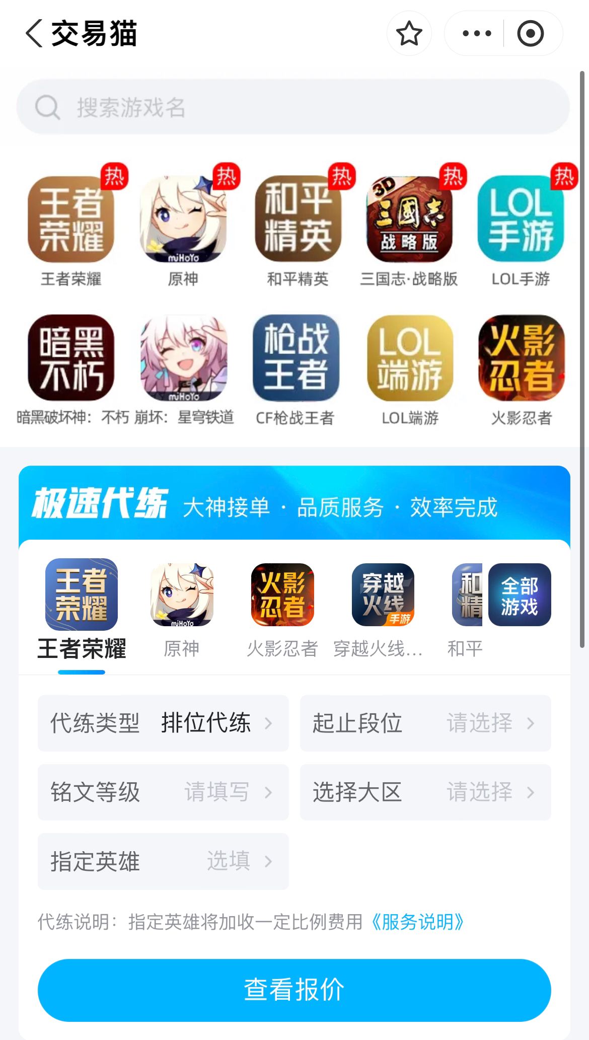 除了基础的账号,交易猫还还为大家贴心的提供了专业的代练服务,对于那些时间有限却渴望提升段位,赢取奖励的玩家来说,这项服务无疑是最佳选择。代练价格公开透明,全程支持录屏监控,保证操作规范透明,帮助用户在最短的时间内完成目标。平台特色的议价功能更是锦上添花,允许买卖双方进行友好协商,帮助玩家节省更多预算,实现更高性价比的结果。