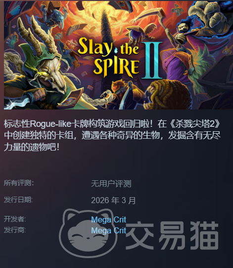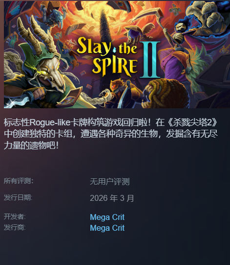 根据Steam页面最新公告,《杀戮尖塔2》确认将于今年3月正式发售。玩家可即刻前往Steam商店页将本作加入心愿单,以便第一时间获取更新提醒与发售通知。