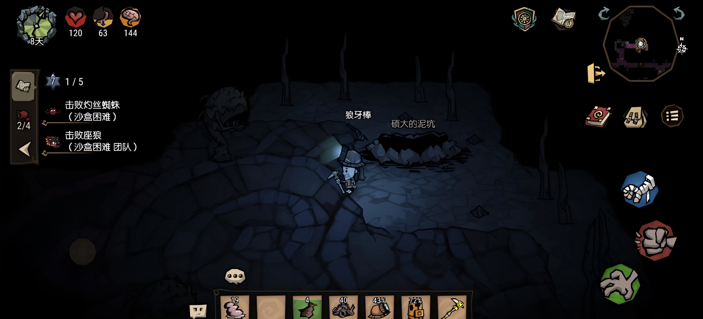理智值系统构成游戏独特挑战维度。白天采集花朵可稳定提升理智值(单朵+5点),同时利于探索效率;而夜间行动将显著加速理智衰减,尤其单独外出或遭遇敌对生物时风险更高。因此,构建具备照明与庇护功能的室内空间,成为中前期关键目标。火把不仅是光源,更是烹饪高级食物的必备条件——例如以浆果、胡萝卜与肉丸组合制成的均衡餐食,可高效补充饱食度;进入中后期后解锁的培根与煎蛋,不仅保质期延长,更具备即时回血效果,大幅优化生存容错率。