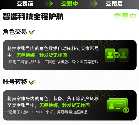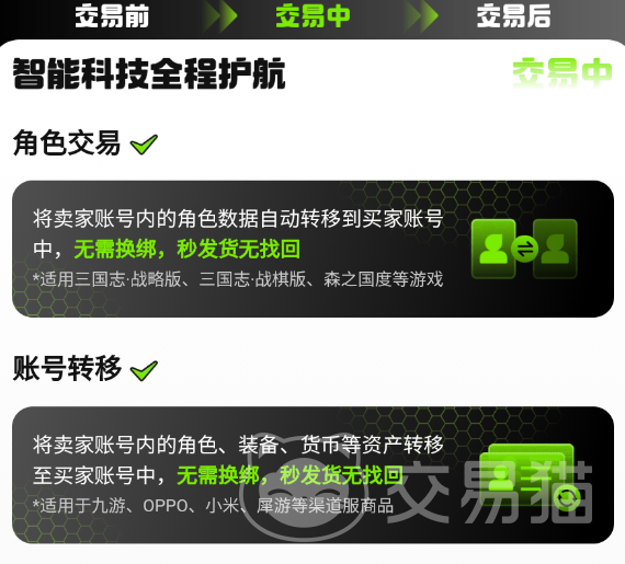交易猫与九游官方具有合作和特色服务——账号转移。那就是将卖家账号内该游戏的所有角色或者道具,转移到一个新九游账号或者买方绑定的账号,而不是传统的修改原账号的密码,且有官方的监督和操作,可以确保账号不会找回。
