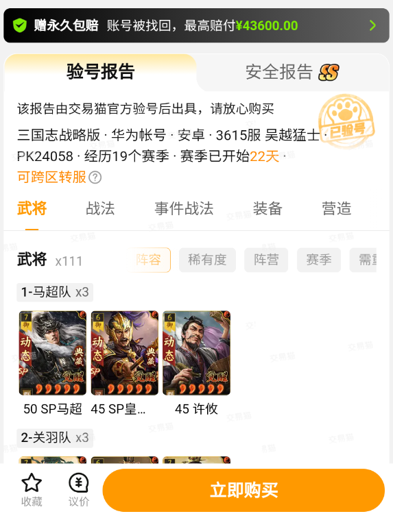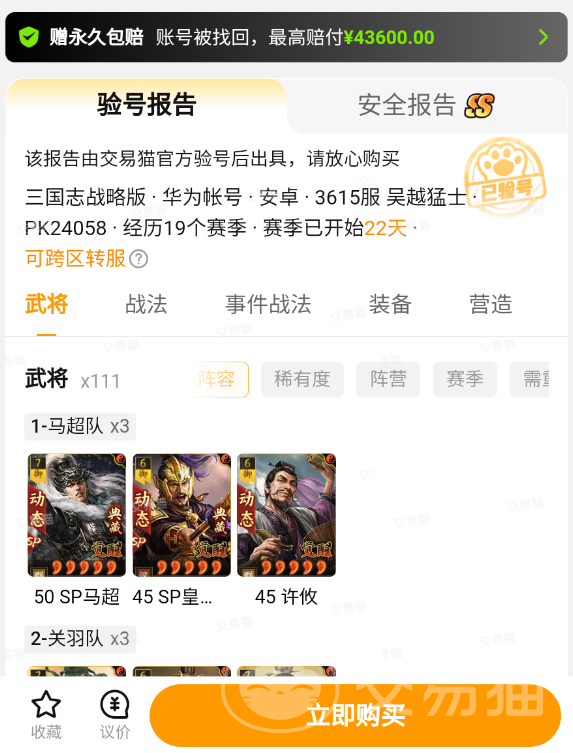 对于买家而言,最关注的就是号的安全性问题和性价比。而交易猫提供永久包赔机制,只要选择带有这个tag的商品,若是在购后发生被恶意找回或者被盗号等异常情况,可以找客服进行申诉,经核实后启动协议赔付流程,最高可全额赔付,切实保护你的权益。同时,真实用户非常活跃的交易猫上,有海量的商品每日上架,不论是低价捡漏大神号还是全皮肤高战力号,闲时多逛一下平台都有机会入手。