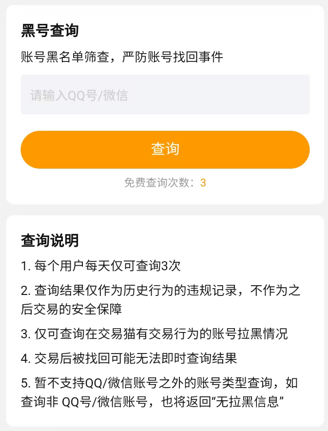 为了进一步提升防骗意识以及督促卖家良好行为,交易猫针对一系列风险还开设了安全中心放在首页,在当中你就能看到有关安全方面交易猫做了多少准备,且一旦发现有卖家存在一系列的违规行为,还可以来这里直接进行举报,甚至还能够输入某个QQ号查询其在交易猫平台当中是否存在过违规行为。