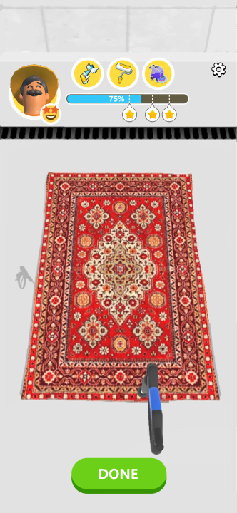 游戏采用分关卡推进机制,每关呈现一张具有独特纹理或几何构图的脏污地毯。任务目标并非统一要求“全面清洁”,而是依据当关指令动态设定——例如某关仅需清除所有可见垃圾颗粒,此时可跳过吸尘器操作,直接使用手指点击拾取并丢弃杂物;若时间充裕,再启用吸尘器进行二次处理,有助于提升最终评分与得分表现。