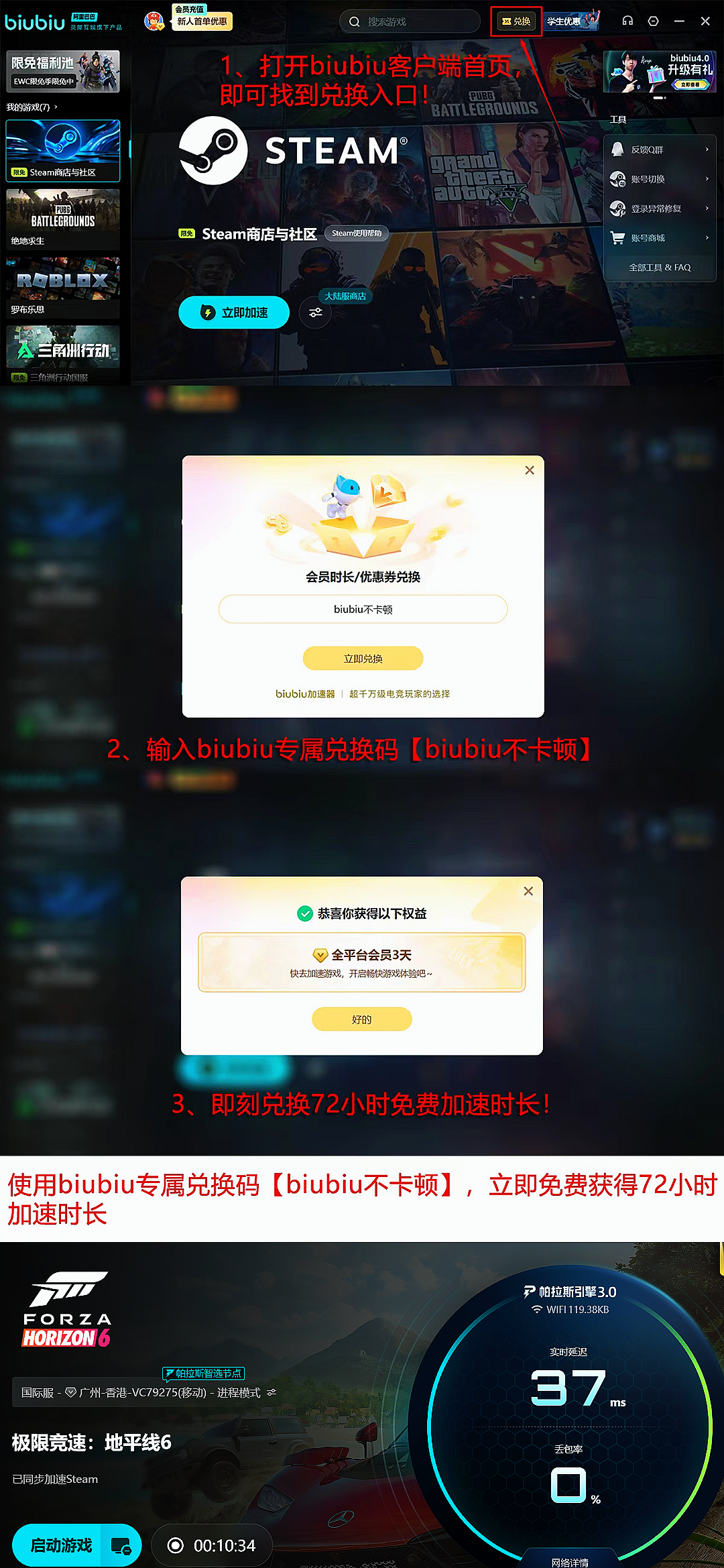 新用户注册后可直接获得24小时全游戏加速权限;所有用户输入口令“biubiu不卡顿”,即可额外领取3天加速时长。该权益适用于《极限竞速:地平线6》及其他主流在线游戏。