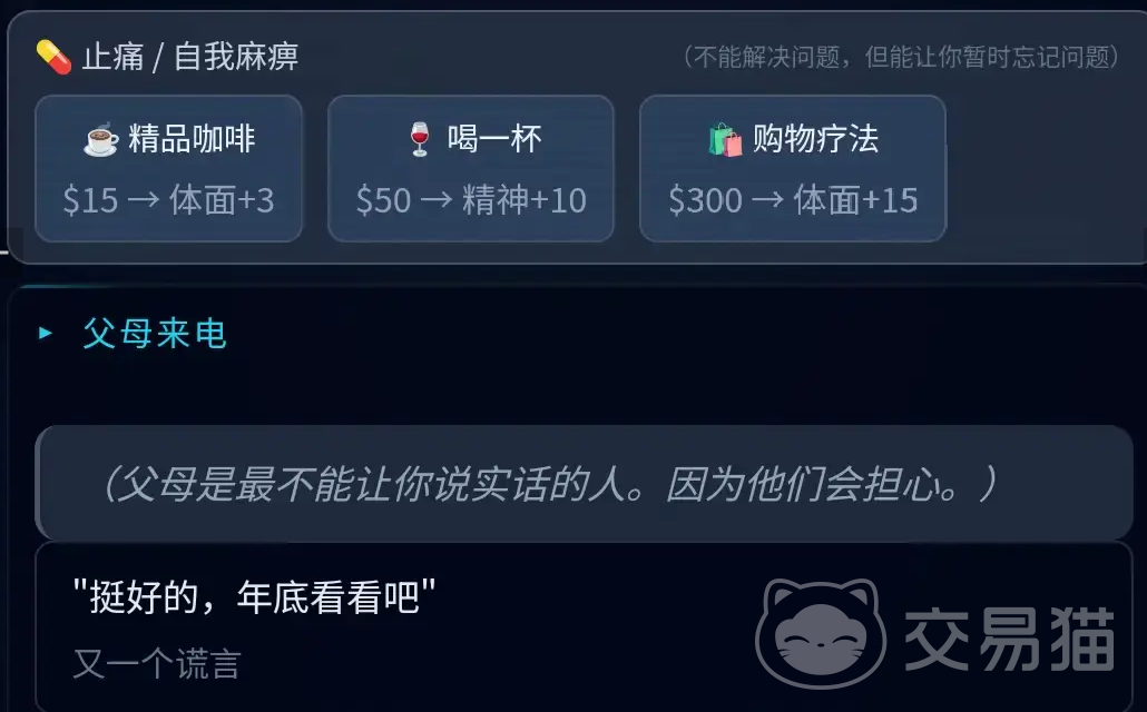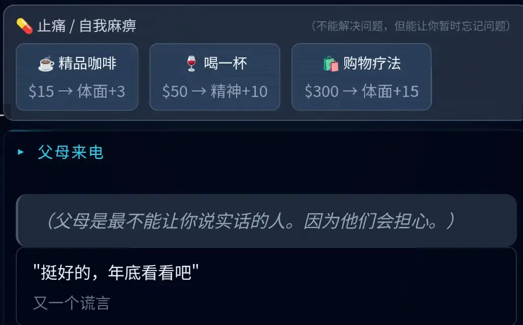 机制设计进一步延伸至社会信用维度:当“体面值”低于临界阈值时,将直接影响求职面试资格;签证状态亦会随时间推移动态变化,若未能及时续签,可能触发“黑户”判定。在此前提下,玩家还需同步处理家庭关系、代际沟通等现实议题,整体叙事视角紧扣当代青年在多重社会角色中的真实处境。