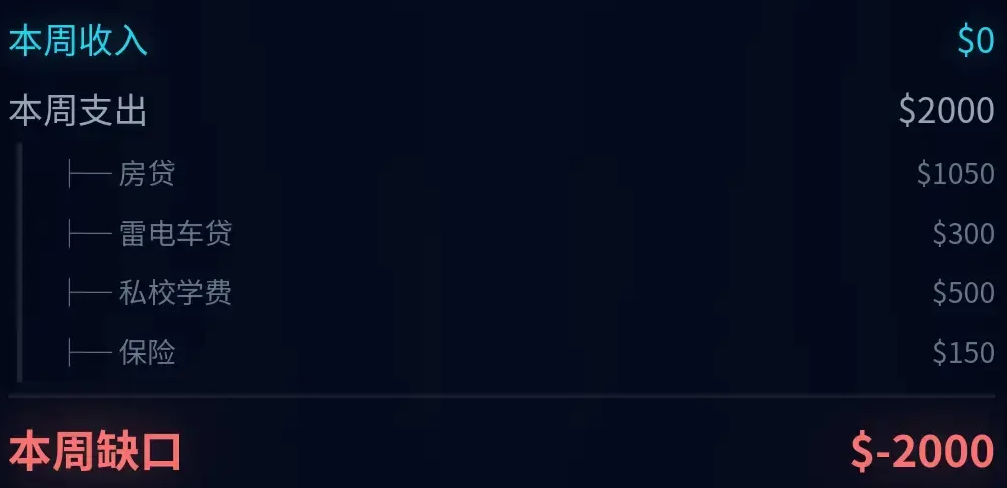 游戏内资金管理系统高度还原现实财务结构,包含但不限于日常开销、住房贷款、车辆分期、教育支出及商业保险等刚性成本模块。各项数值设计贴合当代都市人群普遍面临的经济压力模型,增强沉浸感与代入深度。