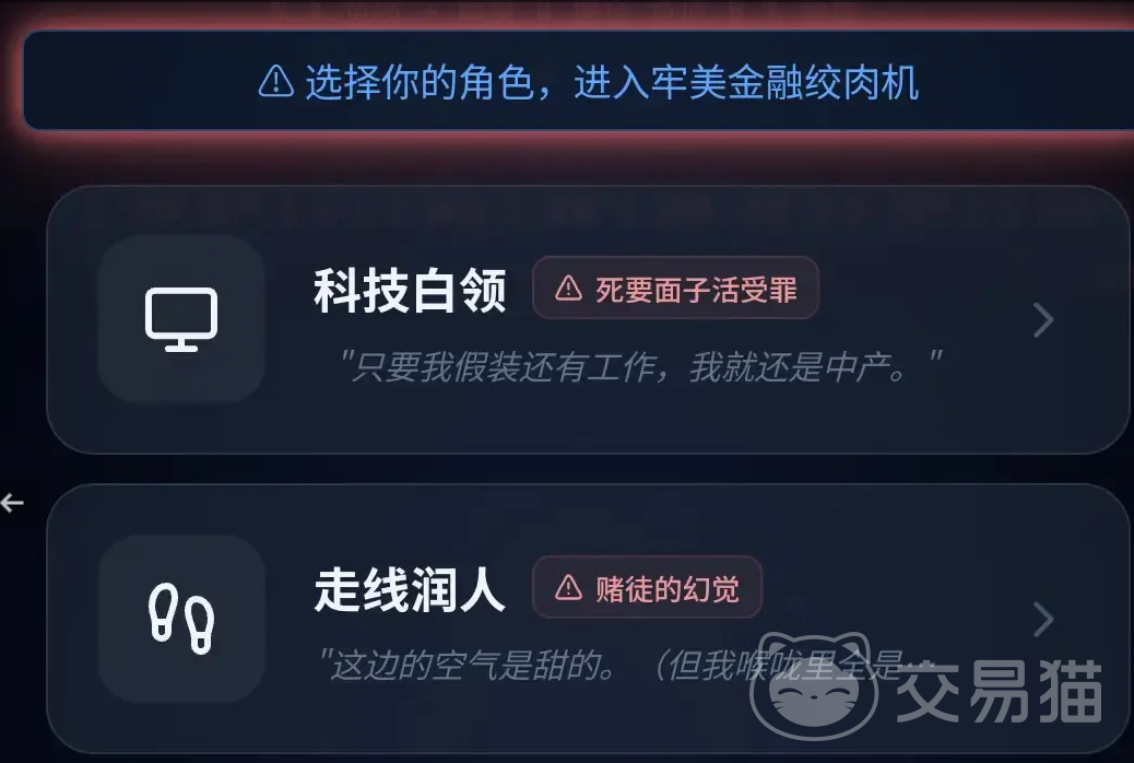 玩家进入游戏后可自由选择初始职业,不同身份将触发差异化的叙事路径与生存逻辑,共同构建“牢美”这一高度拟真的金融化社会图景。职业介绍采用醒目的红色文字标注,直观呈现角色核心属性。例如,“科技白领”表面光鲜,实则承担高强度工作负荷;“网络主播”虽具人气基础,却深陷流量依赖与变现压力之中。