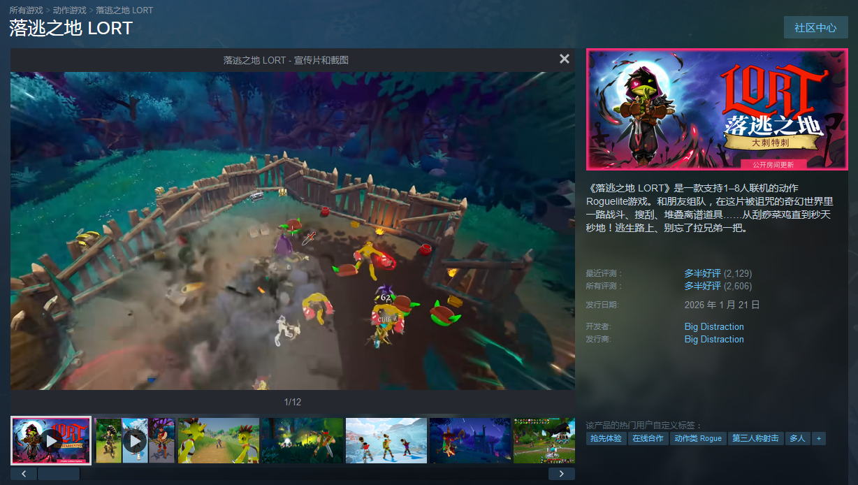 《落逃之地》已于 Steam 平台正式发售,上线时间为 2026 年 1 月 21 日。游戏采用鲜明像素美术风格,整体配色高度饱和,构建出极具张力的喜剧暴力美学氛围。其核心玩法聚焦于“Roguelike 构筑 + 实时多人对抗”的创新组合,支持 1 至 8 名玩家同局联机。组队协作不仅提升战术容错率,更强化了互动笑点密度。