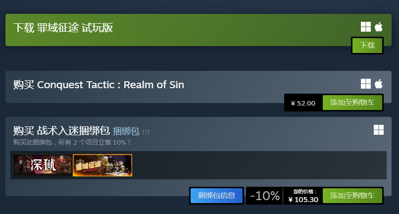 根据Steam平台官方页面显示,《罪域征途》当前标准版定价为52元,暂未开启任何折扣活动。另提供“罪域征途+深狱”双游戏捆绑包,售价105.30元,相较单独购买两作合计节省约10%费用。对于偏好硬核战棋与剧情驱动体验的玩家,该捆绑包具备更高内容密度与长期可玩性,推荐优先考虑。此外,Steam平台已上线免费试玩版本,支持完整前期流程体验,便于玩家在实际投入前评估操作逻辑与风格适配度。