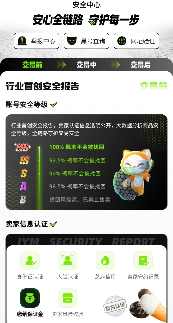不少人在买号时都担心安全的问题,而交易猫是阿里巴巴灵犀互娱大厂旗下品牌,是目前唯一提供永久包赔特色服务的平台,安全得到充分的保障。在选购账号时,勾选带有这类tag的商品,就会安心靠谱很多。哪怕是在售后被卖家恶意找回账号、封禁或者有内容丢失等,可以通过向客服申诉,确认后最高赔付全额。大家在选购时,可以提前看商品页面上的安全报告,这是交易猫首创的,大数据深度验核卖家的芝麻信用分、实名信息、历史守约记录等,得出评分等级帮你清晰预判风险,从下单都交付全方位守护。
