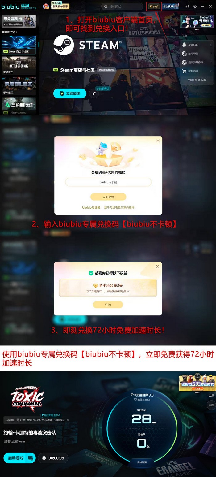 游戏支持四人联机小队模式,战局复杂度显著提升,对网络延迟与连接稳定性构成挑战。此时,专业级网络加速服务成为必要补充。当前适配《毒液突击队》的加速方案已升级至帕拉斯引擎3.0架构,通过智能路由优化与节点动态调度,有效降低丢包率与抖动。该版本经职业选手左梓轩深度参与调优验证,覆盖全平台主流登录方式。所有用户均可凭口令“biubiu不卡顿”兑换3天全平台加速会员权限;新注册用户还将自动获赠24小时免费体验时长,两项权益可叠加使用。