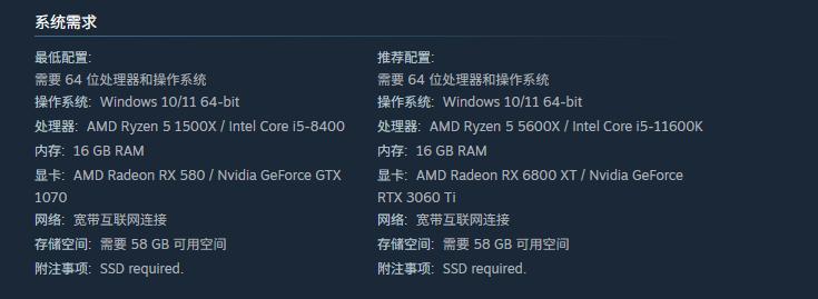 操作系统需为64位Windows 10或Windows 11;CPU推荐Intel Core i5-11600K及以上,或同性能等级的AMD锐龙处理器;内存建议不低于16GB DDR4,以应对长时间运行中逐步增长的资源占用;显卡方面,NVIDIA GeForce RTX 3060 Ti或更高级别为理想选择,确保1080P/1440P分辨率下维持高画质与稳定帧率;存储空间需预留至少58GB可用容量,并强烈建议部署于NVMe固态硬盘,以缩短场景加载与存档读写时间。