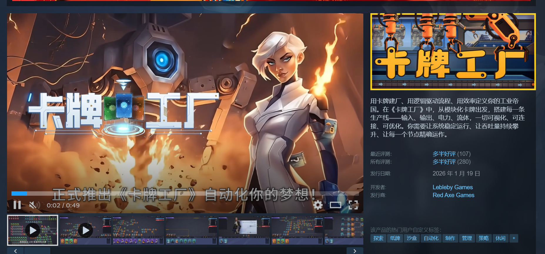 综上,卡牌工厂现已正式发售,发售日期为2026年1月19日。尽管部分支线内容仍在持续完善中,但主体玩法系统、经济模型与成长路径均已完备,适合偏好策略深度与建造自由度的模拟经营爱好者即刻体验。