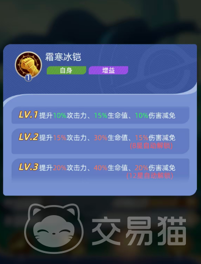 三技能【霜寒冰铠】为其提供全面的个体增益。基础状态下提升10%攻击力、15%最大生命值及10%伤害减免;7星后升至2级,增幅变为15%攻击力、30%生命值、15%减伤;12星解锁3级效果,最终达成20%攻击力、40%生命值、20%伤害减免的满阶属性。该技能虽仅作用于自身,但叠加后的坦度与输出基础,显著强化其在前排承伤与反打中的战略价值。