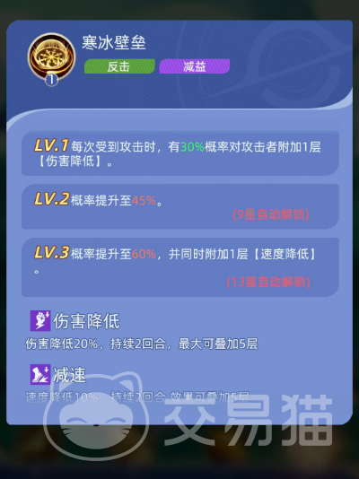 四技能【寒冰壁垒】是其最具策略深度的被动反击技。每当受到攻击时,有30%概率对攻击者施加1层【伤害降低】效果,使其后续2回合内造成的伤害减少20%,该效果最多叠加5层。技能经升级后,13星时概率提升至60%,并额外附加1层【速度降低】,使目标行动速度下降10%,持续2回合,同样可叠至5层。双减益叠加机制,使其在对抗高爆发或高速单位时具备极强反制力,与【极冰之牢】形成“主动控+被动压”的立体控制闭环。