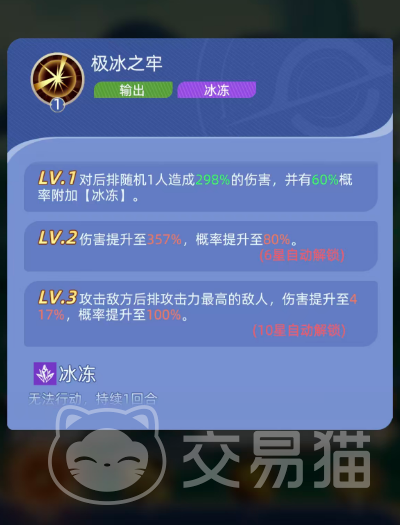 一技能【极冰之牢】是泰斯特拉的核心输出兼控制手段。初始效果为对敌方后排随机单体造成298%攻击力的冰属性伤害,并有60%概率施加【冰冻】状态——使目标跳过下回合行动。该技能随角色星级提升而显著强化:6星时伤害升至357%,冻结概率提升至80%;10星时进一步进化为锁定敌方后排攻击力最高者,伤害达417%,冻结概率100%,实现精准、必中、高伤的三重压制,是当前版本冰冻队破阵的关键启动技。