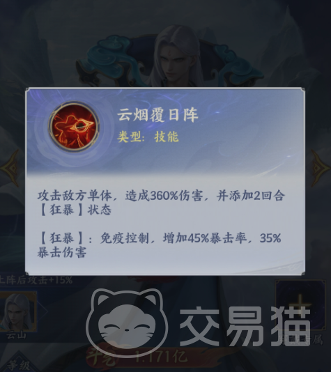 基础技能方面,“推云掌”提供稳定物理伤害,命中率高、不易被闪避;核心大招“云烟覆日阵”锁定单体,造成360%倍率伤害,并附加持续两回合的狂暴状态——期间目标免疫所有控制效果,对敌方控场阵容具备强力反制能力;同时提升自身45%暴击率,且暴击伤害额外增加35%,使其在短时间爆发中具备极高斩杀效率。作为纯物理系风属性角色,云山虽无范围伤害或元素附魔能力,但凭借高穿透、强压制与多段行动机制,在物理队中始终处于战术核心地位。上阵后若激活专属羁绊,还可获得15%攻击力加成,进一步夯实其单点突破能力。