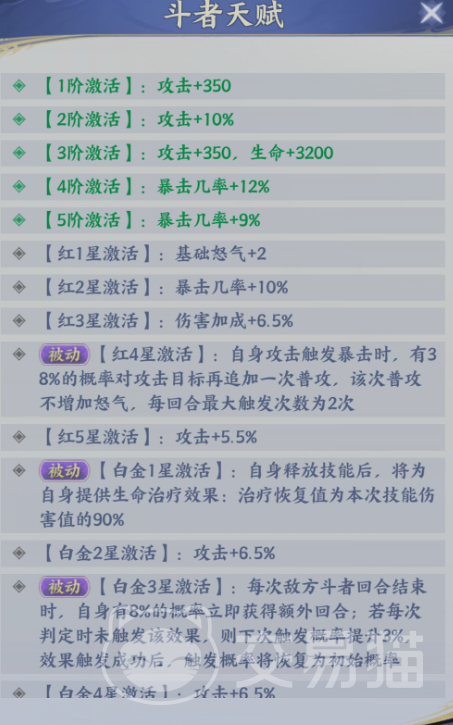 培养路径清晰:从一阶起步即可投入资源,随阶数提升逐步解锁天赋模块。至五阶时,攻击强度与暴击率实现显著跃升;武器天赋激活后,基础暴击概率固定为9%;当星级达到红四星,被动“追击连势”正式生效——每次普攻命中触发暴击时,有38%概率追加一次普通攻击,且每回合最多触发两次,大幅强化行动频次与输出节奏。