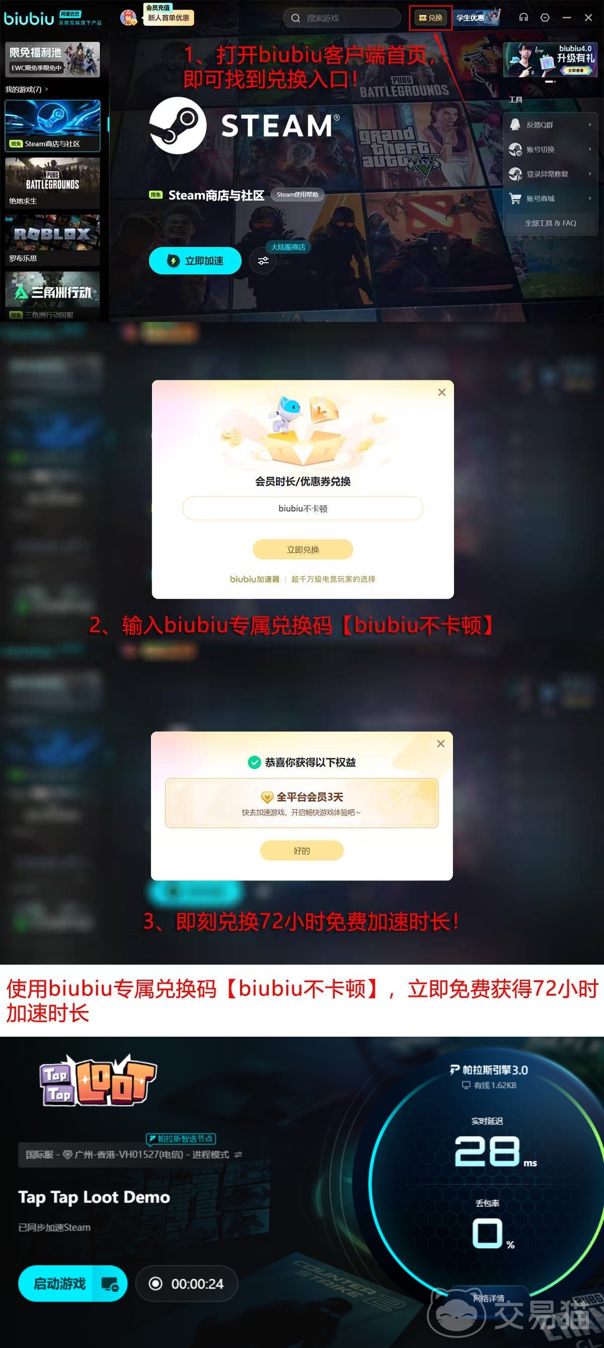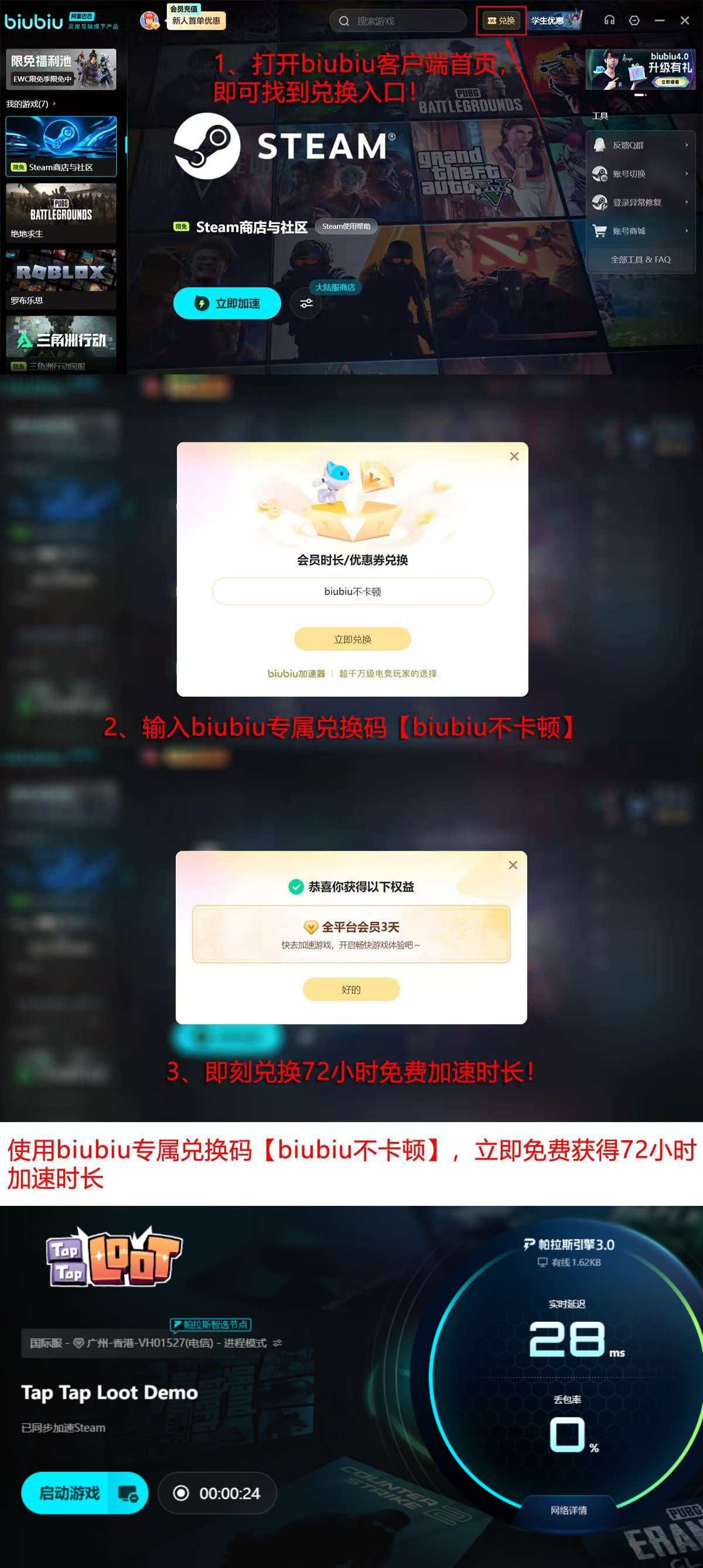 针对新注册用户,平台现开放限时福利:首次登录即可获赠24小时免费加速时长;若在激活页面输入兑换码【biubiu不卡顿】,还可额外叠加72小时加速服务,总计可达96小时。
