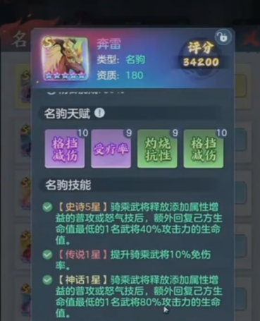 坐骑系统在无限之境中全面解禁,无需培养材料或星级限制即可自由装配。“彩色奔雷”因其泛用性成为首选:基础属性成长曲线优异,拥有格挡减伤(12%)、治疗效果提升(15%)等关键被动;随星级提升,技能持续进化——初始仅对残血单位施放单体治疗,升至满星后可同时恢复两名队友生命,并额外提升全队伤害率8%。该坐骑实质承担起战术辅助职能,使“无限之境”远超普通副本定位,演变为高强度策略推演平台。