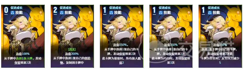 “促进成长”是一张1费功能卡,可解锁50%治愈效果。当指定自身手牌中的创造物时,将触发两次保留效果——例如选择一星壮壮,其30%治愈效果将翻倍至60%。首张使用时自动减费,第二张使用虽费用增加,但新增“削减”词条,同时效果自动转化为复制手牌中任意一张创造物,极大增强场面控制灵活性。