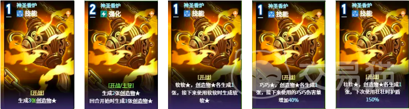 奥莱娅初始卡组配置为两张一费攻击卡、一张一费治疗卡,并自带专属启动卡“神圣香炉”。该卡在战斗开局即生成两张创造物,为后续资源调度奠定基础。三类创造物支持进化系统:两张同名一星卡可融合为二星;一星+二星同名卡可升格为三星;但两个二星卡无法合成三星卡,该限制确保了进化路径的策略唯一性。