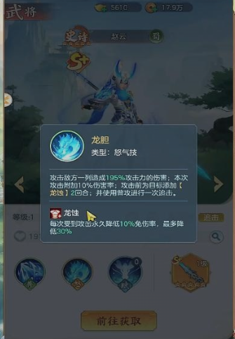 赵云实战表现极为突出:怒气技能“龙胆”可对目标造成195%攻击力伤害,并额外提升10%伤害率;释放后还将追加一次普通攻击。这一机制使其在单体压制与持续输出场景中均具优势。游戏内还定向投放其专属进阶素材,大幅降低培养门槛。前中期依靠赵云即可建立战力优势,在同等级段位中形成有效压制。