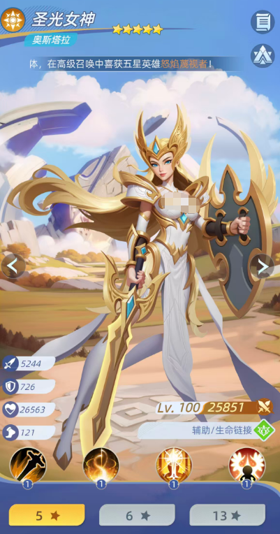 辅助核心选择圣光女神。她以“生命链接”为核心技能,锁定当前生命值最低的友方单位建立灵魂联结,使所有被链接目标共享治疗效果,回复量等同于其攻击力的156%,并附加10%常驻免伤。当该免伤效果叠至5层时,可达成50%高额减伤,显著强化整支队伍的容错率与持久作战能力。