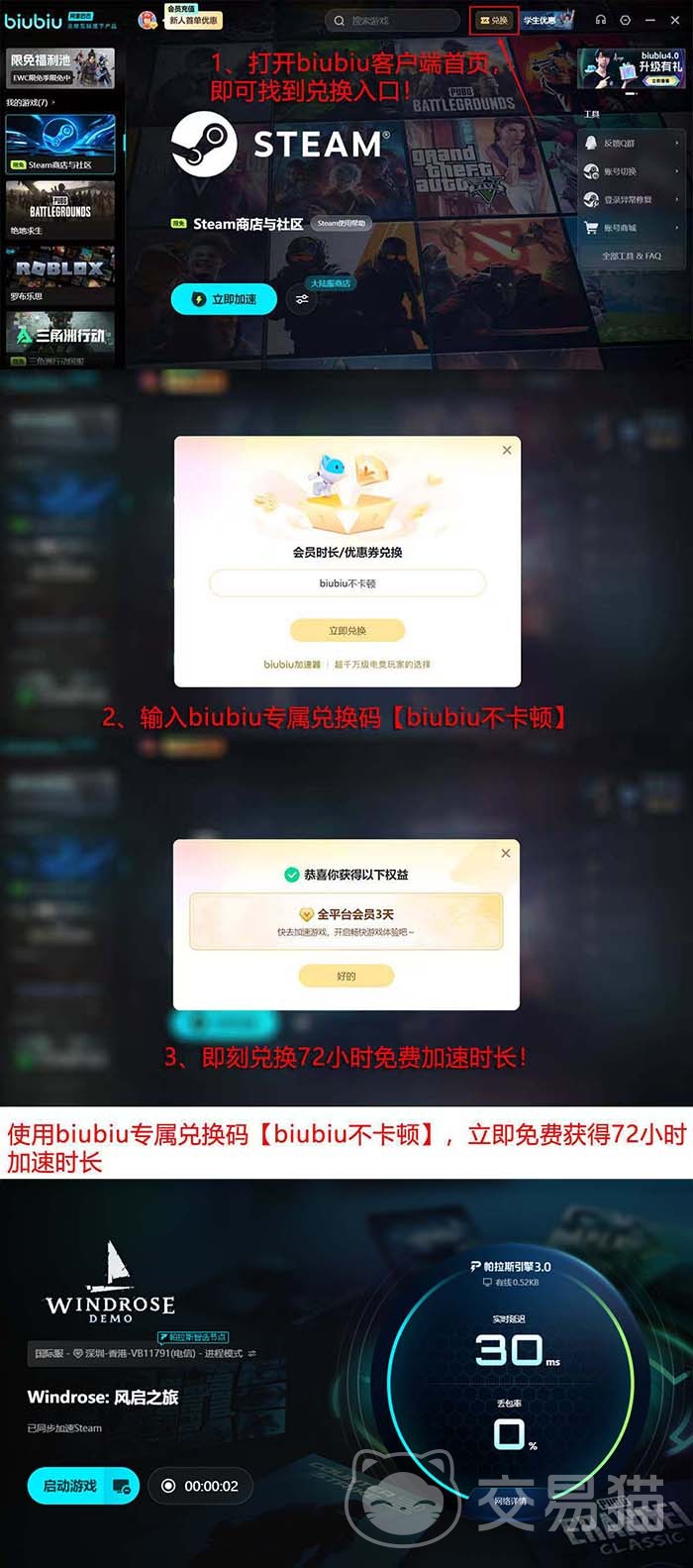 对于有意体验《风启之旅》的玩家,建议优先通过免费时长进行实测验证。新用户注册后系统自动发放24小时加速时长;另可在首页“兑换”入口输入口令【biubiu不卡顿】,额外领取72小时权益,累计达96小时,充分满足试玩及初期体验需求。