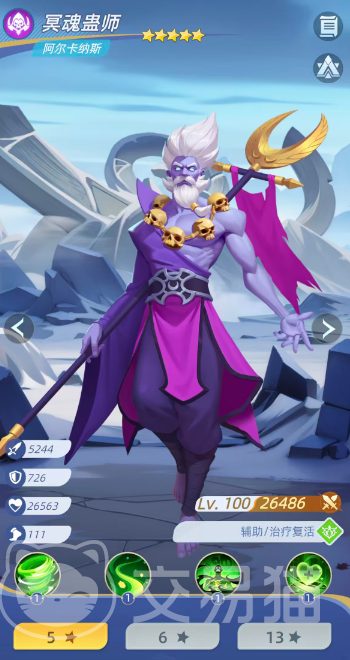 冥魂蛊师(阿尔卡纳斯):定位为兼具续航与战术容错的复合型辅助。怒气技能可为我方全体恢复相当于自身攻击力100%的生命值;同时,必定为目标中生命比例最低者施加“灵魂复生”效果——死亡后依施法者攻击力400%的数值复活。普攻可为当前生命比例最低的友方恢复攻击力45%的生命,并有70%概率驱散其1个减益效果,该效果可连续触发5次,有效缓解团队控制链压力。