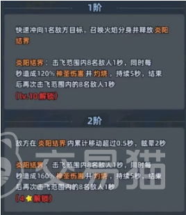 二技能为阶段式结界压制技:初始形态下突进并展开火焰领域,对范围内最多8名敌人造成击飞+120%神圣伤害,并附加持续灼烧;升至第二阶段后,领域内每秒伤害提升至160%,且敌方单位在结界中移动累计达0.5秒即触发眩晕;第三阶段进一步强化控制深度——眩晕时长延长至3秒,结界总持续时间同步提升。该技能全程无目标类型限制,是团队集火前摇、打断Boss技能循环及构建安全输出窗口的关键支点。
