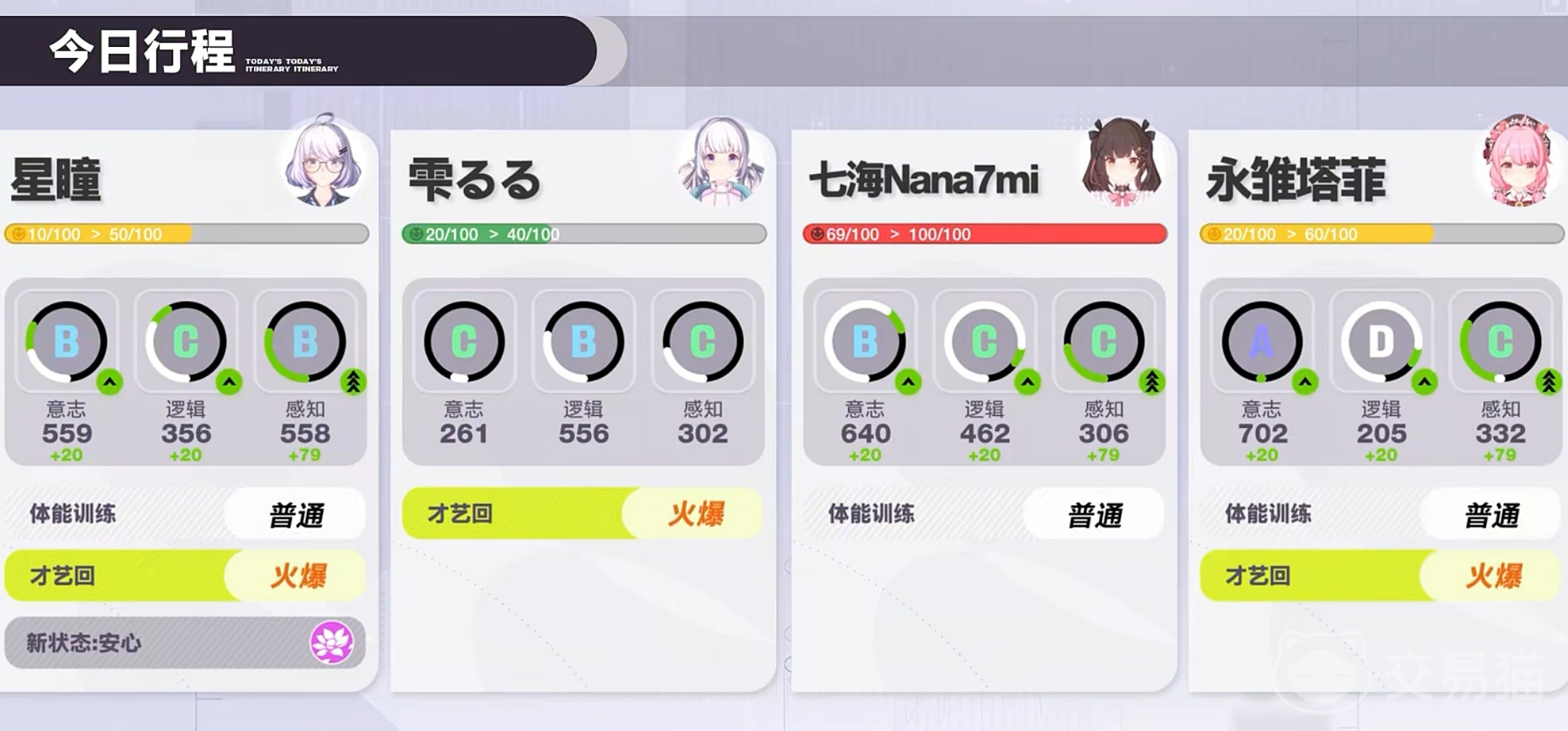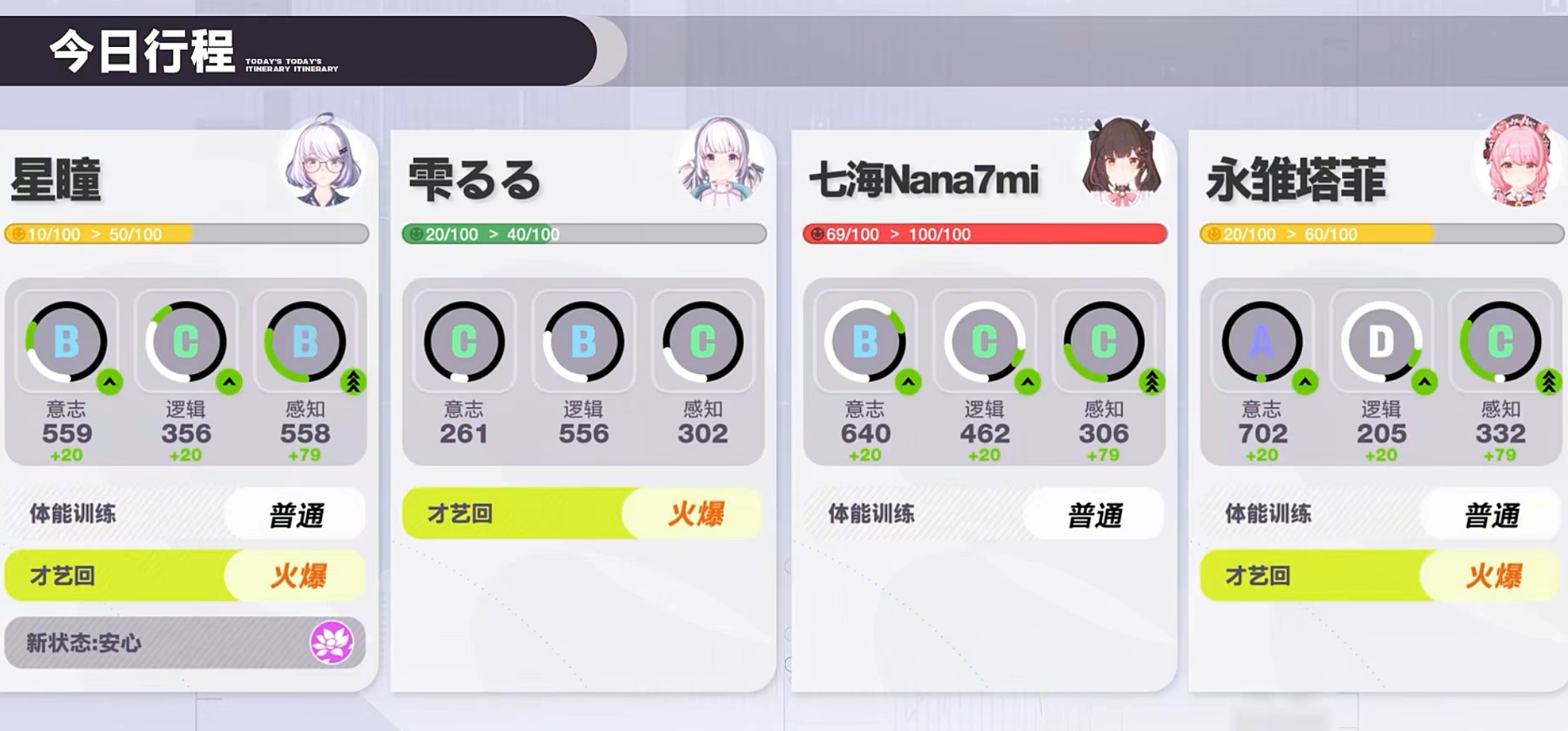 关于“虚环角色行程安排”,系统提供三类可调度行为:直播、训练与休息。直播行为可稳定获取粉丝数量与积分奖励;训练则作用于角色三维核心属性——意志、逻辑与感知(如图左侧所示),直接关联其在战斗中的策略响应能力与状态稳定性;休息行为用于缓解压力值,并恢复粉丝量——该数值在战斗中等效为角色总生命值,而积分则是兑换“心得卡”的唯一通用货币。合理分配三者,是维持偶像长期发展节奏的关键。